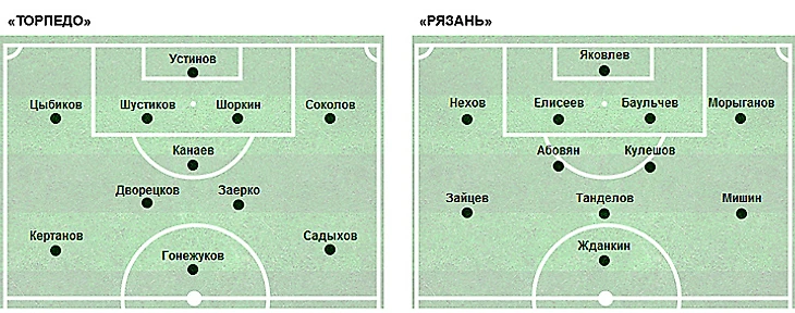 «Рязань» произвела в своём составе две замены по сравнению с матчем первенства против подольского «Витязя»: на поле появились Игорь Нехов и Сергей Зайцев, во встрече с подольчанами выходившие на замену. Соответственно на лавку у «Торпедо» сели Роман Косянчук и Иван Мельников, а у «Рязани» - Владислав Лабзин и Георгий Журавлёв. Но если у «Торпедо» замены были по позиции, то у «Рязани» произошли изменения в схеме: отыгравший предыдущий матч в обороне справа Мартун Абовян занял место в опорной зоне, а Нехов стал исполнять роль правого защитника.