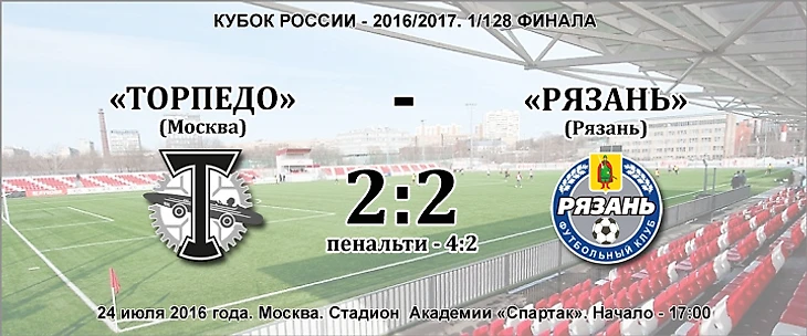 В матче 1/128 финала Кубка России московское «Торпедо» после ничьей 1:1 в основное время и 2:2 - в дополнительное по пенальти переиграло ФК «Рязань» и в 1/64 финала встретится с брянским «Динамо».