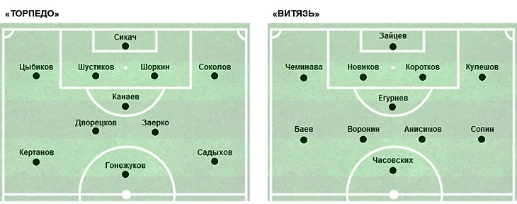 У «Торпедо» несколько раз проседала зона правого защитника – благо левый хавбек «Витязя» Максим Сопин всё никак не мог подстроиться под мяч и принять передачу. Когда же, наконец, принял, торпедовцам пришлось спешно выносить мяч на угловой. Хозяева ответили дриблингом и ударом с левого угла штрафной оказавшегося по эпизоду на чужом фланге Константина Кертанова – вратарь «Витязя» свою команду выручил. Гости в свою очередь били опасный штрафной слева – мяч задел игроков в стенке и свечой улетел на угловой.
