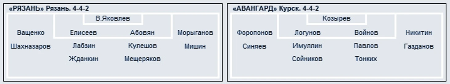 «Рязань»: В.Яковлев, Елисеев, Мишин (Журавлев, 67), Ващенко, Шахназаров (Зайцев, 56; Нехов, 90+), Кулешов, Лабзин (Маричев, 73), Жданкин (Б.Яковлев, 90+), Морыганов, Мещеряков, Абовян.