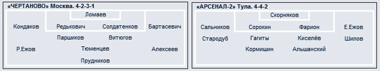 «Чертаново»: Ломаев, Бартасевич, Солдатенков, Редькович, Кондаков (Котов, 83), Витюгов (Селюков, 86), Паршиков, Р.Ежов, Тюменцев (Глушенков, 75), Алексеев (Цыпченко, 80), Прудников.