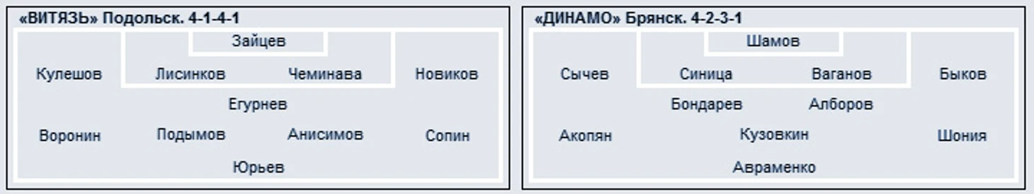 «Витязь»: Зайцев, Лисинков, Чеминава, Егурнев, Воронин, Анисимов, Новиков (Барышников, 74), Кулешов, Юрьев, Подымов, Сопин (Баев, 63).