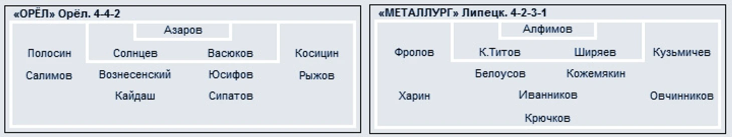 «Орёл»: Азаров, Полосин, Васюков, Косицин, Солнцев, Салимов, Вознесенский (Ручкин, 72), Юсифов, Рыжов, Кайдаш, Сипатов (Николаев, 76).