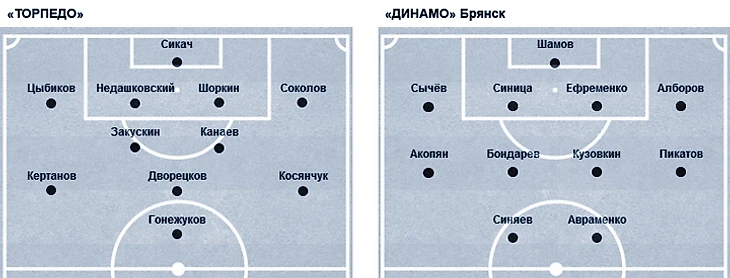 Во втором тайме после замены Недашковского на Заерко Закускин стал играть правого центрального защитника (вместо Недашковского), а Заерко занял место в опорной зоне. Остальные замены у «Торпедо» были по позиции.