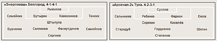 «Арсенал-2»: Суслов, Ребенко, Ежов, Фарион, Сальников, Сорокин (Гагиты, 50), Стародуб, Шилов, Гордиенко (Матренов, 46), Киселев (Кормишин, 77‘), Степанов (Альшанский, 55).