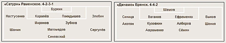 «Сатурн»: Буркин (Романенко, 36), Королёв, Покидышев, Злобин, Синявский, Настусенко, Миронов, Зубков, Сергулёв (Никитянов, 64), Шанин (Крапивников, 54), Магомедов (Семячкин, 90+).