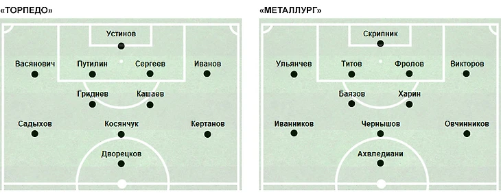 44-я минута. Голевой момент у гостей. Атака сходу «Металлурга», Чернышов простреливает справа вдоль ворот «Торпедо», левый защитник Викторов наносит зрячий удар в противоход перемещающемуся от штанги к штанге Устинову, но летящий в ворота мяч выбивает почти с самой линии Путилин.