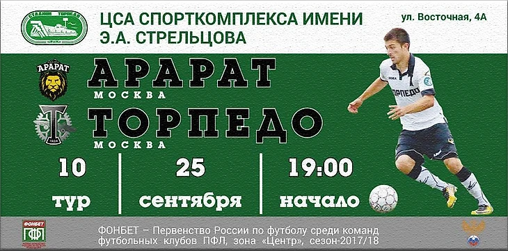 25 сентября на стадионе имени Э.Стрельцова в Москве состоится поединок главных конкурентов за выход в ФНЛ из группы «Центр» - «Торпедо» и «Арарата». Номинальными хозяевами поля будут считаться «араратовцы».