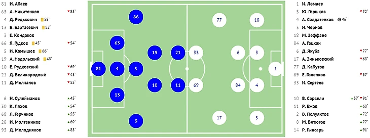 Удары - 7:17. Удары в створ – 5:8. Угловые – 3:6. Офсайды – 1:0. Сэйвы – 6:4. Фолы – 16:15. Владение мячом – 43%:57%.