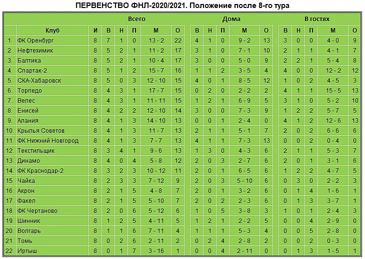 После восьмого тура первенства ФНЛ «Оренбург» упрочил своё лидерство, на втором месте обосновался получивший три очка за Брянск «Нефтехимик», «Крылья Советов» застряли на экваторе таблицы, а «Торпедо», одержавшее вторую подряд волевую победу в гостях, теперь всего в паре шагов от места, дающего путёвку на повышение в классе.