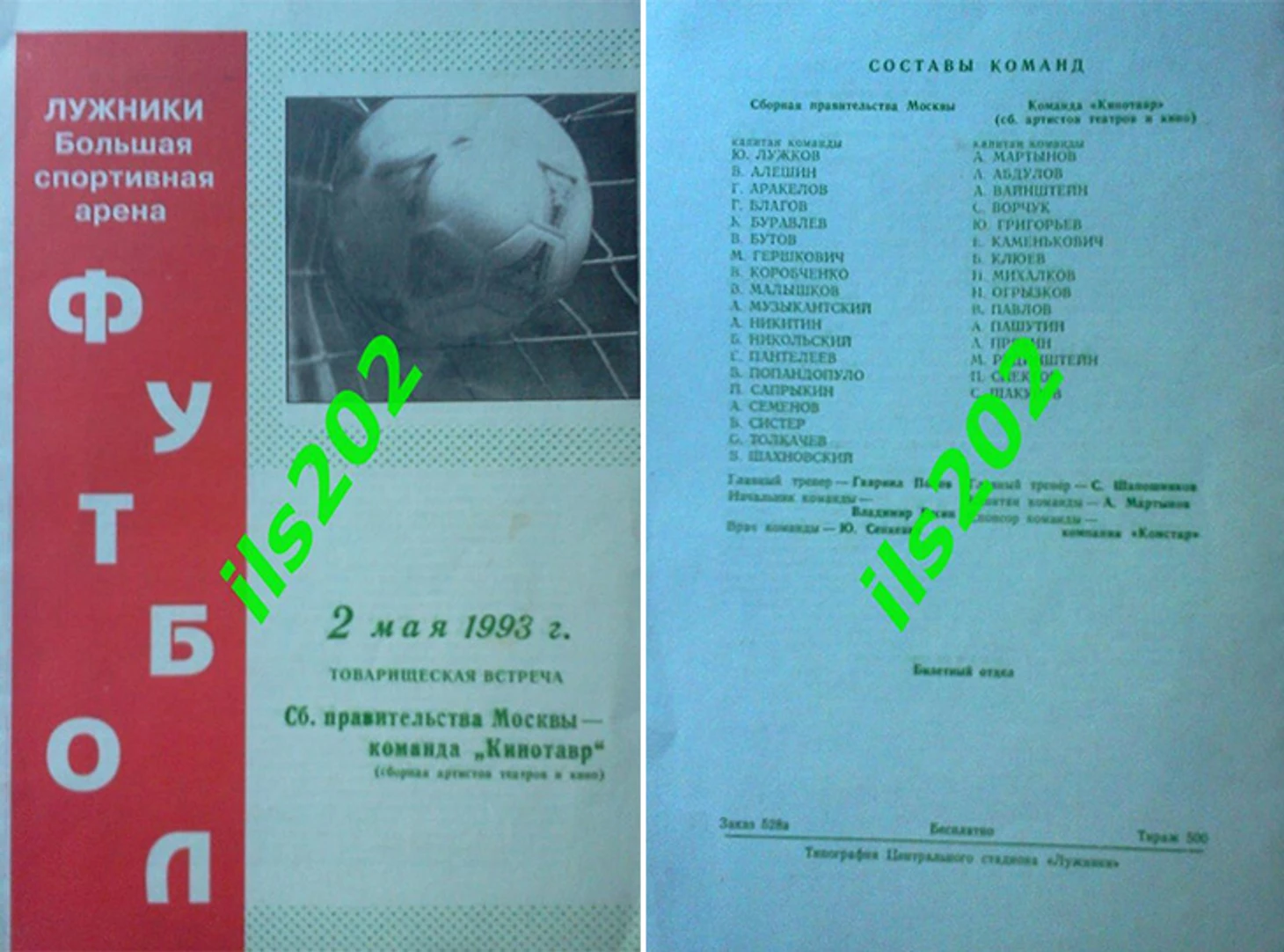 Несмотря на то, что в качестве места проведения указана БСА, игра проходила в Спортгородке. Как попавший на неё, утверждаю: Лужков, Алёшин, Гершкович и Музыкантский (префект ЦАО) на поле присутствовали. А в сборной актёров весьма прилично для любительского уровня выглядел недавно ушедший из жизни Борис Клюев, в молодости серьёзно занимавшийся футболом, а затем являвшийся президентом футбольной команды Малого театра и одним из основателей Театральной футбольной лиги Москвы.