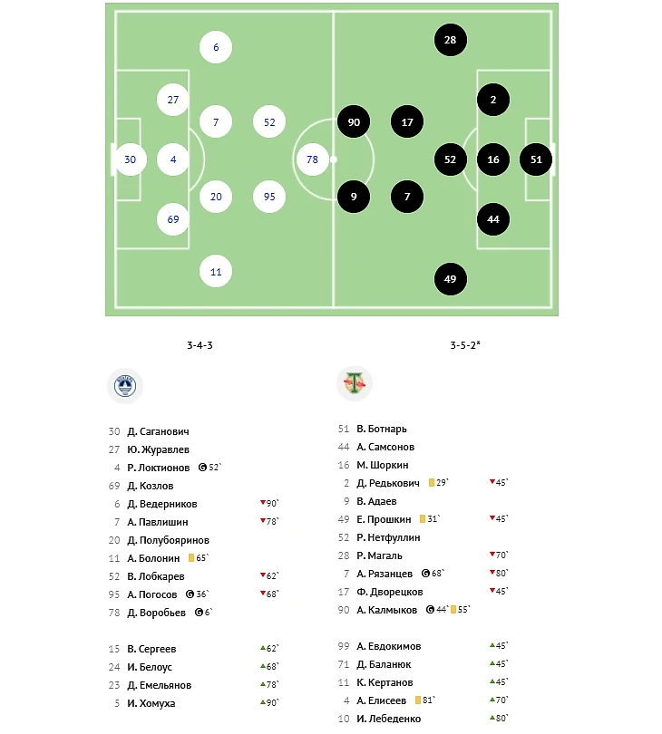 Голы: 1:0 Воробьёв (7), 2:0 Погосов (38), 2:1 Калмыков (45+1), 3:1 Локтионов (53), 3:2 Рязанцев (69). Нереализованный пенальти: Магаль (26, вратарь).