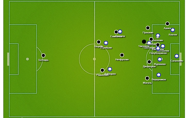 Что касается схемы, то она была гибридной. И, если отбросить латералей Прошкина и Магаля, постоянно перестраивалась вдоль центральной оси с 3 (три защитника справа налево Редькович – Шоркин – Самсонов) – 1 (Нетфуллин) – 2 (Рязанцев (левее) – Дворецков (правее)) – 2 (Адаев (левее) – Калмыков (правее)) на 3 (три защитника справа налево Редькович – Шоркин – Самсонов) – 2 (Рязанцев (левее) – Нетфуллин (правее)) – 2 (инсайды Адаев (левее) – Дворецков (правее)) – 1 (Калмыков). И варьировалась она постоянно, иногда при каждом новом владении. За счет того что по одному футболисту вдоль центральной оси опускалось ниже, то по одному футболисту вдоль центральной оси поднималось выше. На рисунке выбран первый из расписанных ее вариантов, в котором Нетфуллин в опорной зоне один (без Рязанцева), а Адаев находится на одной линии с Калмыковым, а не под ним в роли инсайда наряду с Дворецковым.