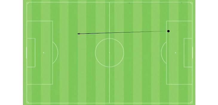 Длина передачи 58 метров (от момента схода мяча с ноги Болонина до момента касания мяча ноги Воробьёва). Скорость Воробьёва значительно выше, чем у защитника «Торпедо» Шоркина, к тому же во время забега у Шоркина чуть едет нога. Воробьёв добегает до мяча первым, оказывается один на один с вратарём «автозаводцев» Ботнарем и переигрывает его.