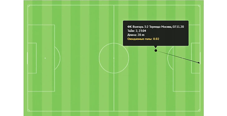 Самсонов вбрасывает аут с левого фланга на ход Рязанцеву в центр, тот догоняет мяч и, пользуясь отсутствием сопротивления, поскольку опасности из-за большого расстояния особой вроде бы и нет, наносит великолепный полунавесной удар в дальний угол. Дистанция до ворот – 28 метров, xG гола – 0.02. То есть из 100 ударов, нанесенных из такой позиции при таком сопротивлении и при таком положении вратаря, лишь 2 завершатся голом.