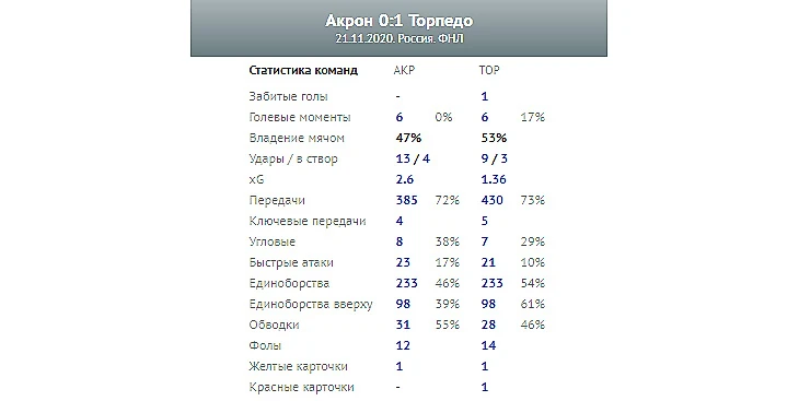 Рейтинг футболистов «Торпедо» и «Акрона» от спортивного аналитического агентства InStat