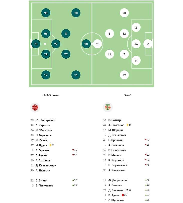46-я минута. Филипп Дворецков → Илья Берковский. При этом Кертанов начал играть в атаке в паре с Калмыковым, а Дворецков – действовать под ними, и схема «Торпедо» изменилась с 3-4-3 на 3-5-2.