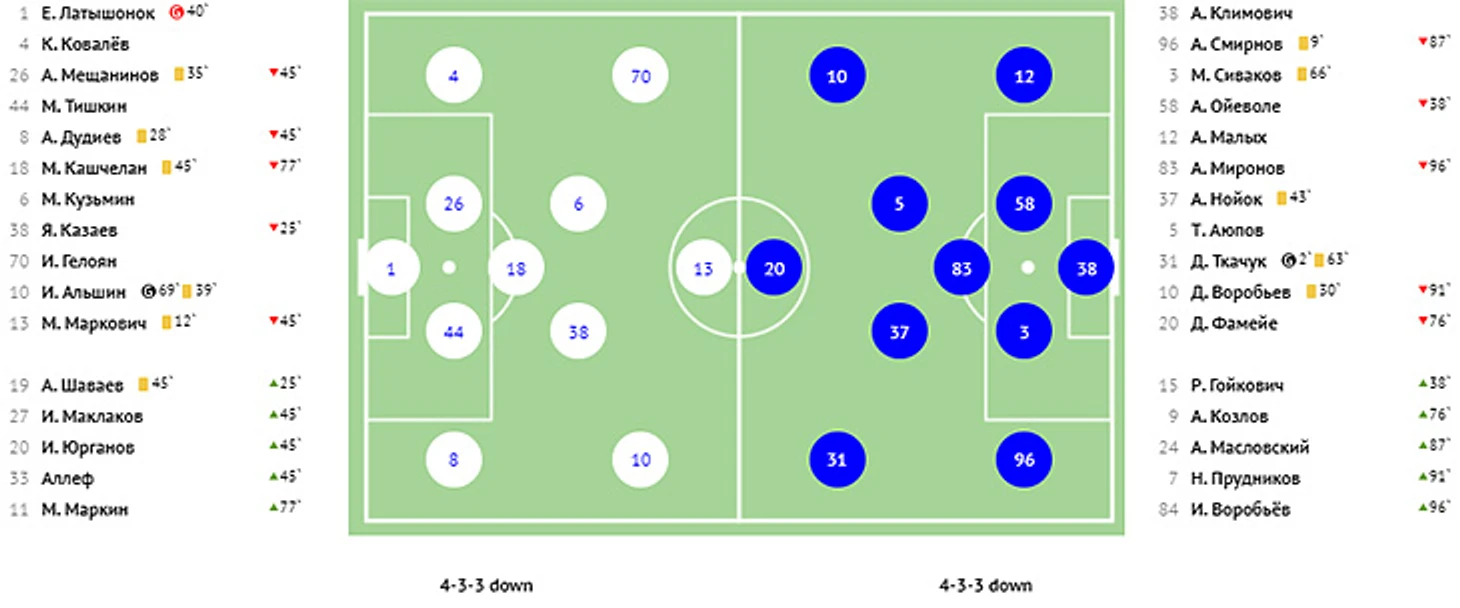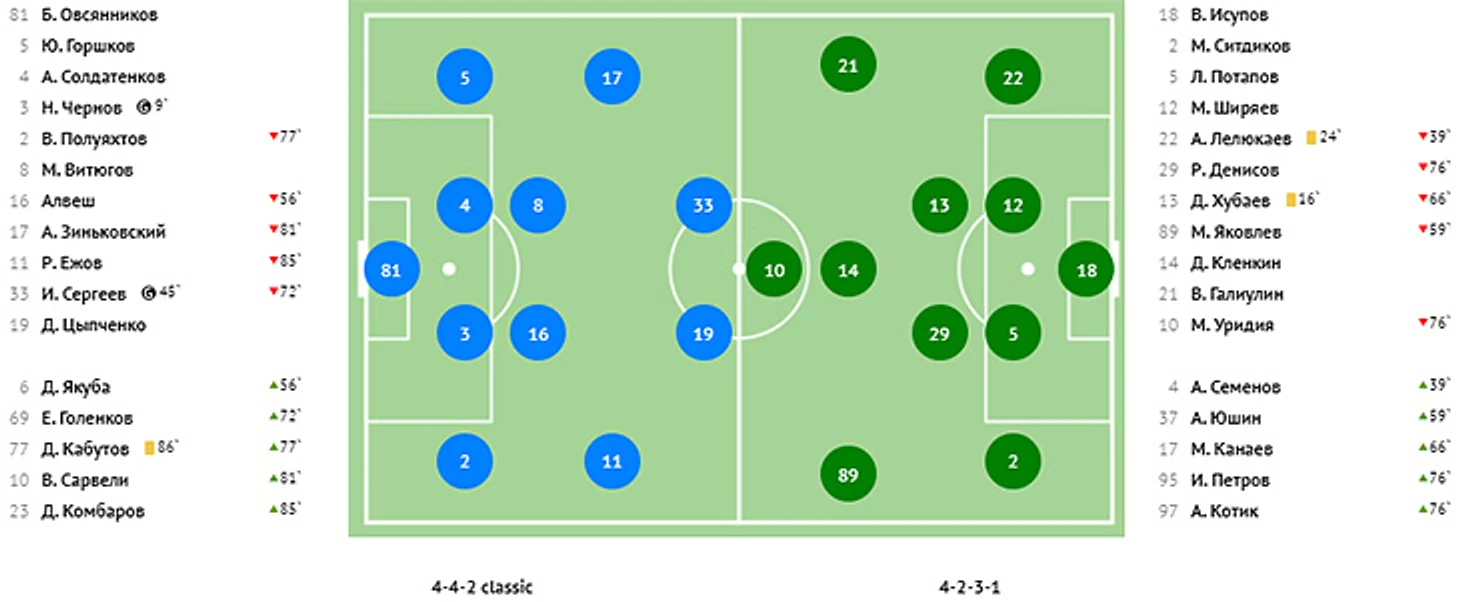 Первая домашняя заготовка хозяев сработала уже на пятой минуте. Подача Максима Мартусевича, скидка Эмерсона и точный удар под штангу за авторством Дмитрия Баркова. На 30-й минуте Кирилл Большаков идеальным ударом закрутил мяч над «стенкой» точно в «девятку». А на 65-й минуте Эмерсон выпрыгнул при угловом ударе и чётко пробил. Правда, большую оплошность совершил кипер красно-белых Александр Селихов, неудачно сыгравший на выходе. Бразилец бил уже по пустому створу.