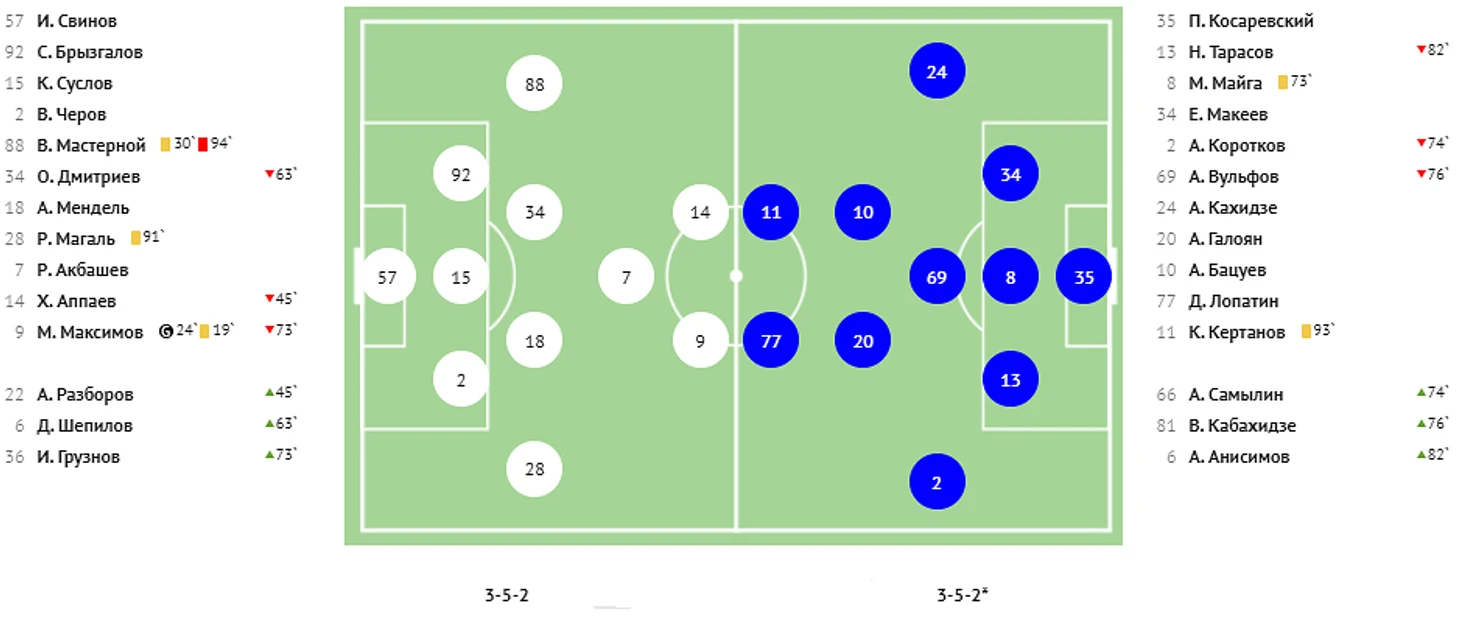 Голы: Марков, 6 - в свои ворота (0:1). Кичин, 27 - с пенальти (1:1). Петров, 34 (1:2). Кичин, 63 - с пенальти (2:2).
