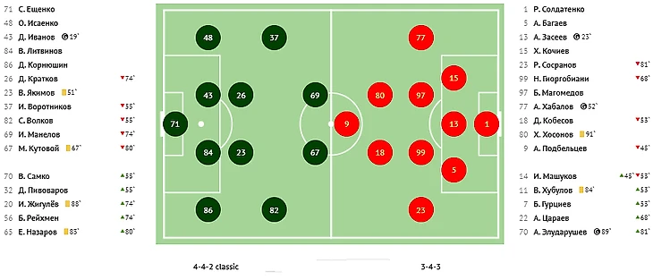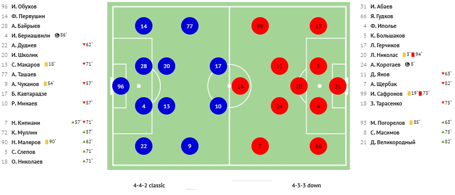 Голы: Иванов, 19 (1:0). Засеев, 24 (1:1). Хабалов, 52 (1:2). Эльдарушев, 89 (1:3).