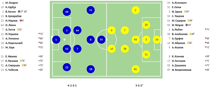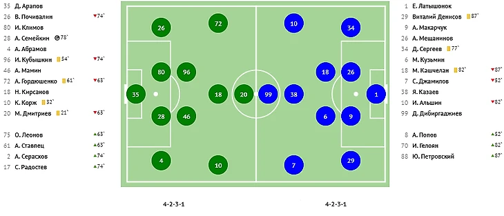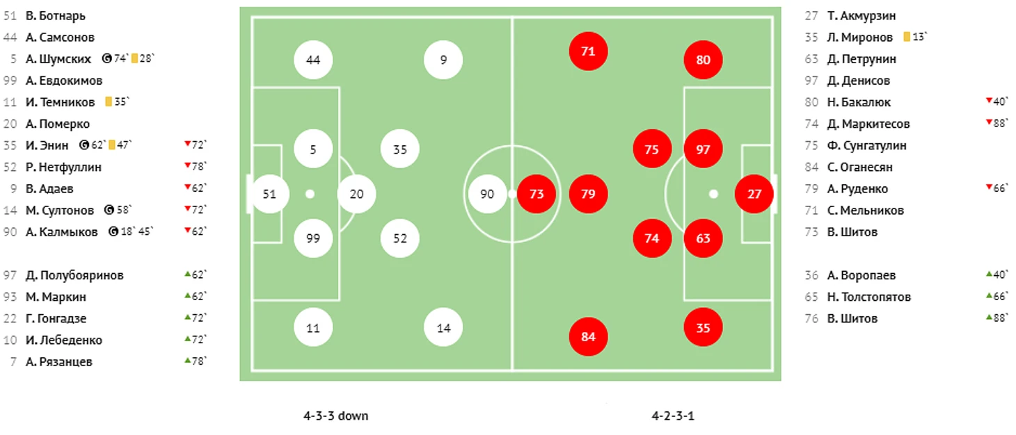 Голы: Калмыков, 18 (1:0). Калмыков, 45 (2:0). Султонов, 58 (3:0). Енин, 62 (4:0). Шумских, 74 (5:0).