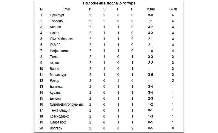 Один из претендентов на выход в РПЛ, «Балтика», в двух стартовых турах набрала всего одно очко – ничья 3:3 в Воронеже и поражение 0:1 в Томске. Главный фаворит сезона, «Оренбург», на старте дважды с одинаковым счетом 4:0 разгромил на своём поле сначала «Волгарь», а потом липецкий «Металлург».