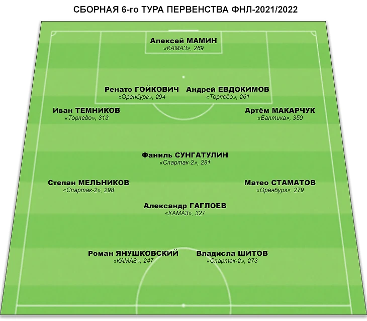 Символическая сборная 6-го тура ФНЛ. По три игрока – из «Спартака-2» и «КАМАЗа», по два – из «Торпедо» и «Оренбурга»