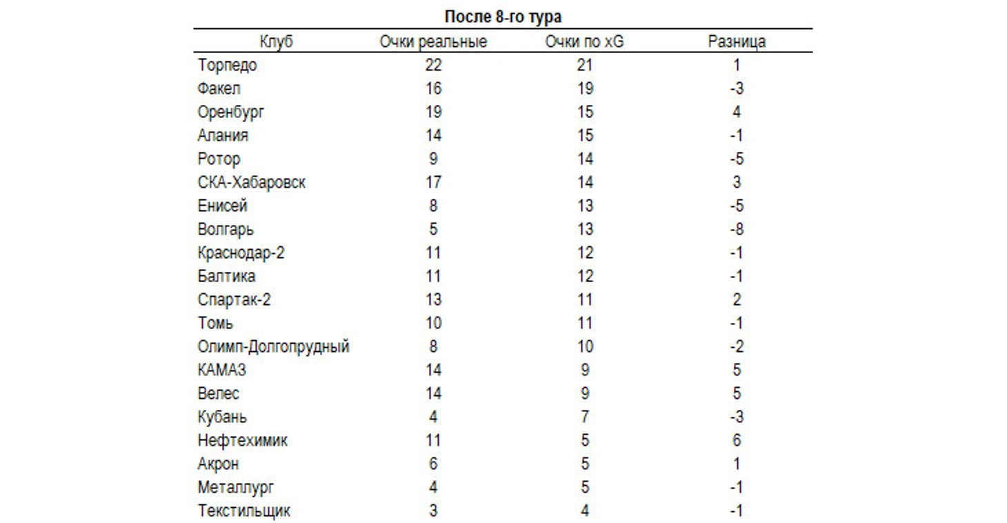 А теперь посмотрим, каковы бы были результаты матчей 8-го тура первенства ФНЛ, если бы они заканчивались в строгом соответствии с теорией «ожидаемых голов».