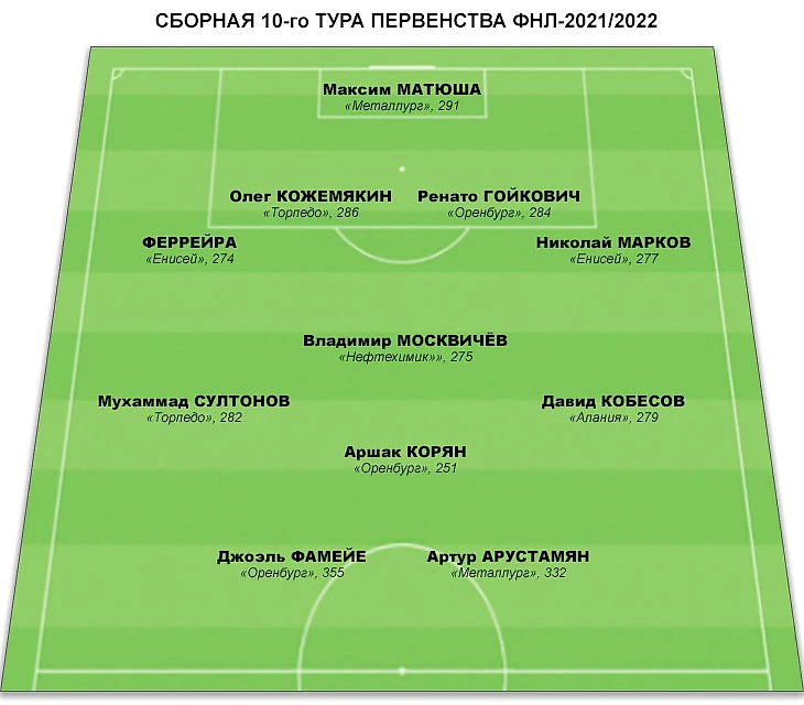 Сборная 10-го тура ФНЛ. Трое игроков из «Оренбурга», есть представители «Торпедо», «Енисея» и даже «Металлурга»