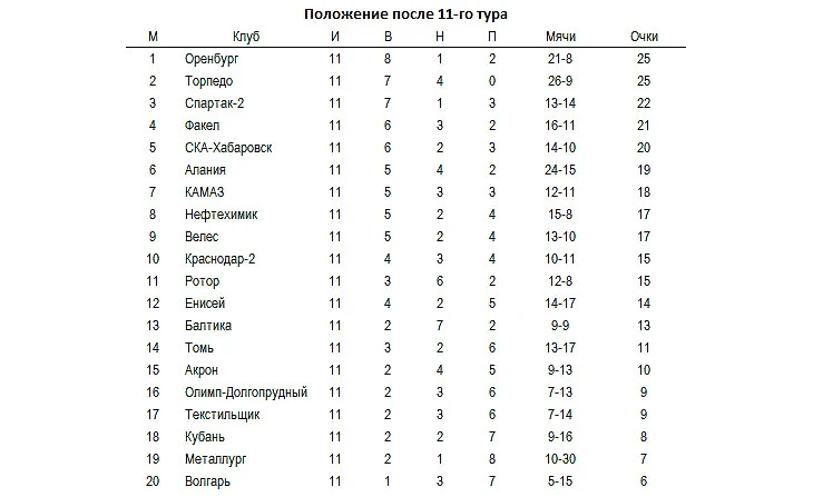 «Оренбург» сместил с первой строчки «Торпедо», в следующем туре командам играть друг с другом. Итоги 11-го тура ФНЛ