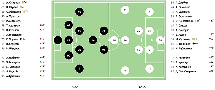 Голевые моменты имели (реализовано) Темников – 1 (1) Евдокимов, Орехов, Султонов, Рязанцев, Калмыков – по 1 (0) Голевые моменты создали Султонов – 2 Орехов, Темников, Рязанцев, Кравчук – по 1