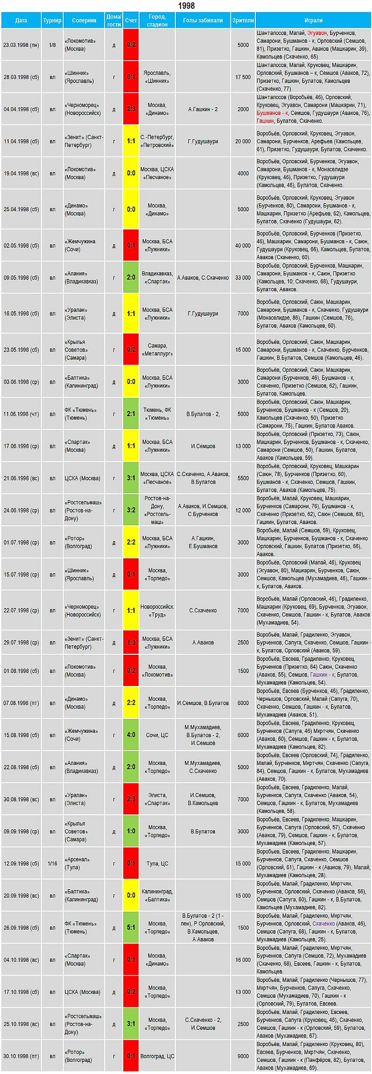 После удачного, прежде всего, на международной арене 1997 года, когда «Торпедо» дошло до полуфинала Кубка Интертото и через него едва не попало в Кубок УЕФА, ожидалось, что на второй сезон пребывания в стане «автозаводцев» Александра Тарханова, сопровождавшегося перестройкой стиля, команда сумеет проявить себя и на внутренней арене.