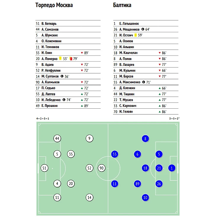 Голы: Султонов, 36 (1:0), Мещанинов, 64 (1:1), Максименко, 71 (1:2), Лебеденко, 74 (2:2). Удаление: Померко («Торпедо», 80). Москва. Спортивный городок «Лужники». 650 зрителей. Удары - 14:10. В створ – 7:3. Угловые – 3:10. Фолы – 13:8. Владение мячом – 51% : 49%. xG – 1.30 : 0.91