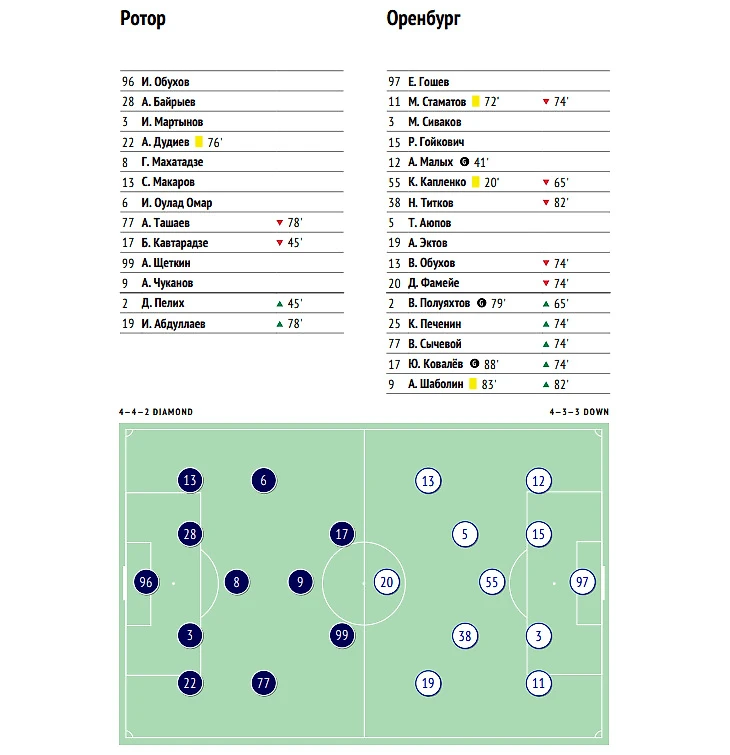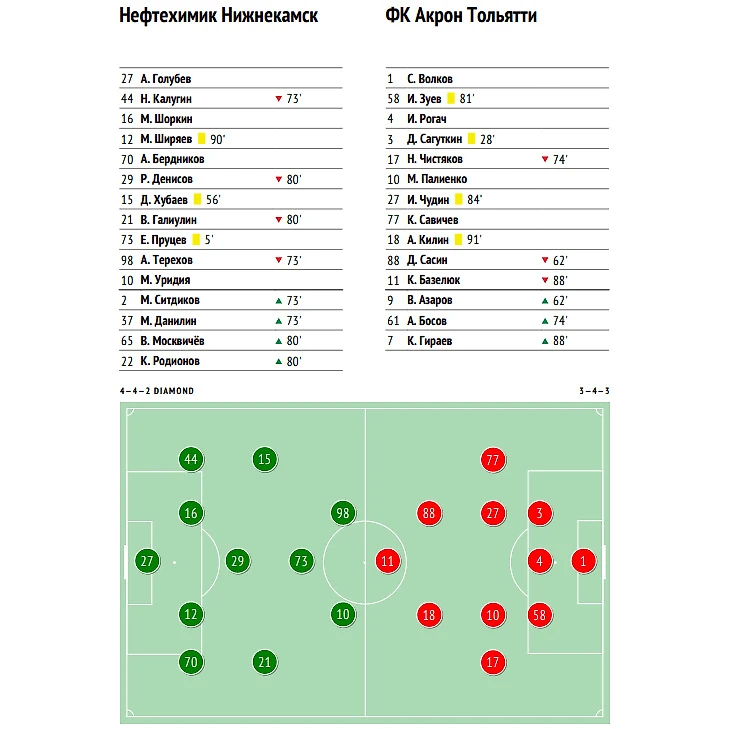 Нижнекамск. Стадион «Нефтехимик». 320 зрителей. Удары - 10:10. В створ – 2:3. Угловые – 4:2. Фолы – 14:20. Владение мячом – 61% : 39%. xG – 0.56 : 1.08