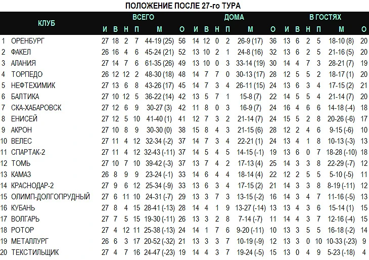 В минувшую субботу состоялся 27-й тур первенства ФНЛ. «Торпедо» и «Балтика» разошлись миром, «Алания» поднялась на третью строчку таблицы, а фаворит на бумаге «Ротор» после поражения от «Оренбурга» всерьёз рискует вылететь в низший дивизион.