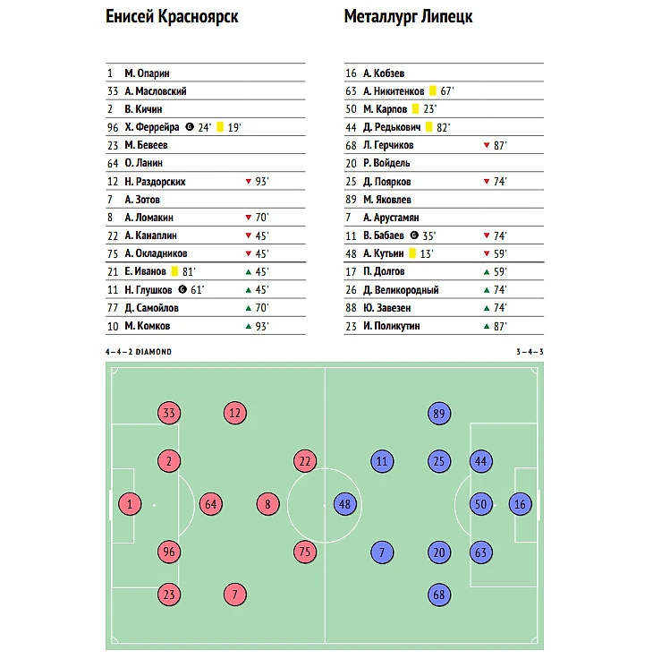 Голы: Феррейра, 23 (1:0), Бабаев, 35 (1:1), Глушков, 61 (1:0). Красноярск. Футбол-Арена «Енисей». 2720 зрителей. Удары - 15:6. В створ – 7:2. Угловые – 8:2. Фолы – 10:12. Владение мячом – 64% : 36%. xG – 1.73 : 0.67.