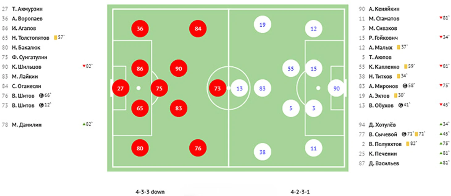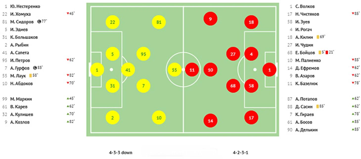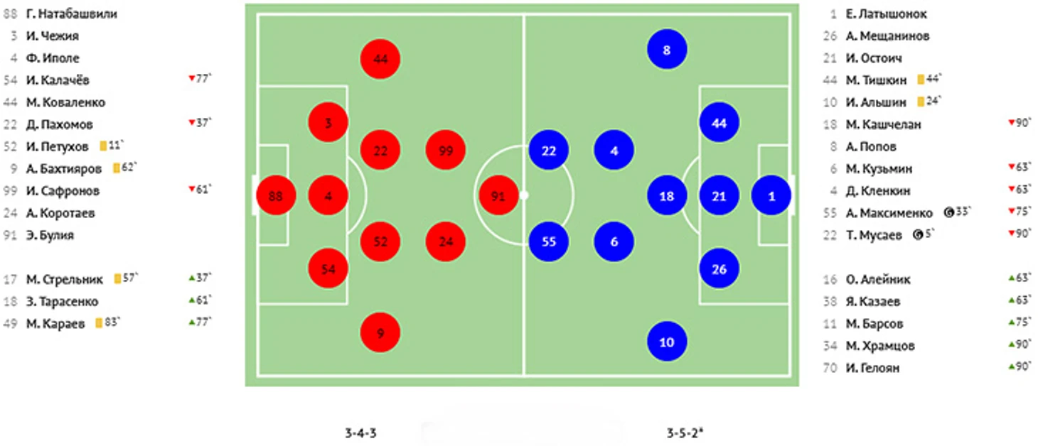 Взбодрённый удачей Халназаров создал еще три опасных момента и, в конце концов, выполнил ставшую результативной передачу с правого края на дальнюю штангу, где Кучугура успешно сыграл головой. 3:1! Ну, а затем «КАМАЗ» ошибся в своей атаке, краснодарец Кучугура получил мяч на левом фланге, выполнил передачу на Губжокова, тот по центру вышел к воротам и с помощью красивой подсечки пробил в правый от себя нижний угол. Крупное поражение в гостях закрепило «КАМАЗ» в зоне вылета.