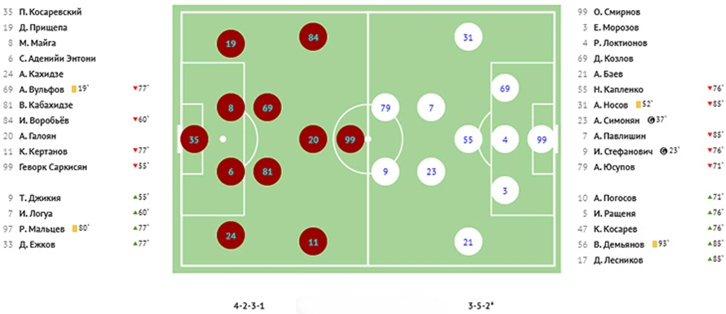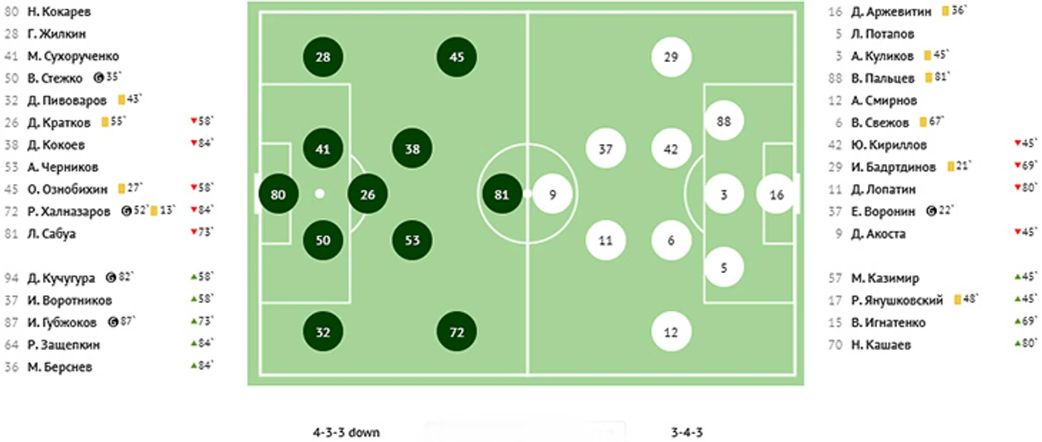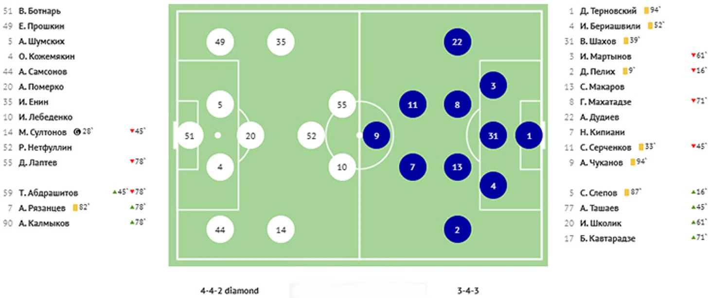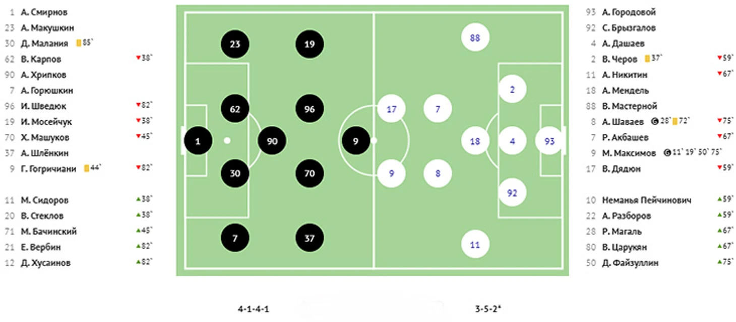 Взбодрённый удачей Халназаров создал еще три опасных момента и, в конце концов, выполнил ставшую результативной передачу с правого края на дальнюю штангу, где Кучугура успешно сыграл головой. 3:1! Ну, а затем «КАМАЗ» ошибся в своей атаке, краснодарец Кучугура получил мяч на левом фланге, выполнил передачу на Губжокова, тот по центру вышел к воротам и с помощью красивой подсечки пробил в правый от себя нижний угол. Крупное поражение в гостях закрепило «КАМАЗ» в зоне вылета.