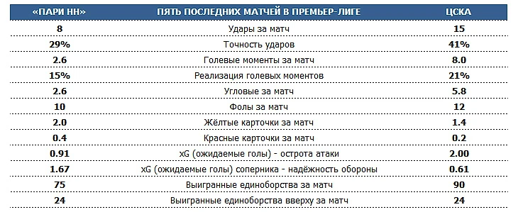 🕮 Факты: ◉ «Пари НН» не может выиграть отдельно взятый второй тайм на протяжении 13 матчей подряд. Так что если нижегородцы к концу первого тайма не поведут в счёте, то они с большой долей вероятности уже не выиграют. ◉ Из девяти последних матчей в РПЛ «Пари НН» выиграл лишь один. ◉ Шесть последних матчей на своём поле «Пари НН» сыграл с тоталом меньше 2.5. ◉ В семи последних матчах с участием ЦСКА в РПЛ ставка «обе забьют» не срабатывала. ◉ ЦСКА не может выиграть на выезде в РПЛ четыре матча подряд и набрал в них всего одно очко из 12 возможных. ◉ Лишь один тренер в российской истории ЦСКА выигрывал три первых для себя матча в чемпионате. В 2002 году с пяти побед подряд стартовал Валерий Газзаев. Владимир Федотов в случае успеха в Нижнем Новгороде добьётся третьей победы подряд и продолжит погоню за достижением Газзаева, заодно превзойдя результаты Олега Долматова, Александра Кузнецова, Хуанде Рамоса и Ивицы Олича.