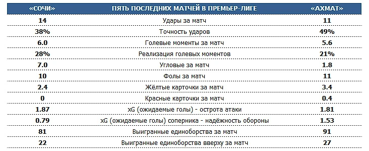 🕮 Факты: ◉ «Ахмат» ни разу не выигрывал у «Сочи» в чемпионате России, а все три матча на выезде проиграл. ◉ В матчах с «Ахматом» «Сочи» набрал максимальное количество очков – 16. Вторые и третье места в этом списке делят «Ростов» и «Спартак», в играх с которыми сочинцы набрали по 13 очков. ◉ «Сочи» не проигрывал на своём поле четыре матча подряд, но победил лишь в одном из них, а ещё три свёл вничью. ◉ «Ахмат» не проигрывал в РПЛ шесть туров, но в семи последних матчах на выезде одержал лишь одну победу.