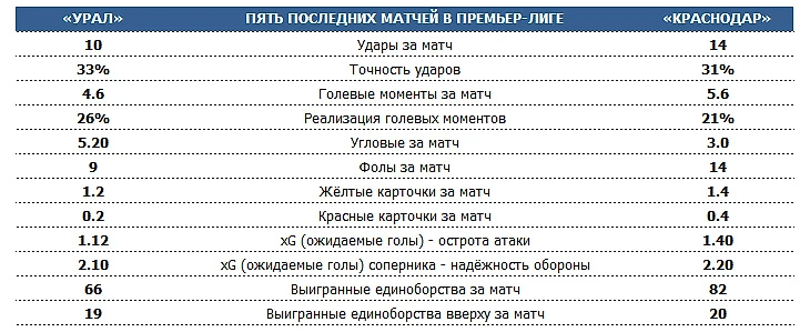 Баланс матчей «Урала» и «Краснодара» в чемпионатах России: суммарный: +3=5-10, мячи 15:35 на поле «Урала»: +2=2-5, мячи 9:15 пять последних матчей «Урала» и «Краснодара» на поле «Урала» – 0:1, 1:2, 2:4, 1:0, 0:3 Крупные победы – 0:4. Волевые победы – 1:1. Голы с пенальти – 0:5.