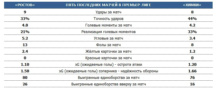 Баланс матчей «Ростова» и «Химок» в чемпионатах России: суммарный: +3=2-3, мячи 7:7 на поле «Ростова»: +2=1-1, мячи 5:4 последние четыре матча «Ростова» и «Химок» на поле «Ростова» – 1:1, 2:0, 0:2, 2:1 Крупные победы – 0:0. Волевые победы – 0:0. Голы с пенальти – 1:2.