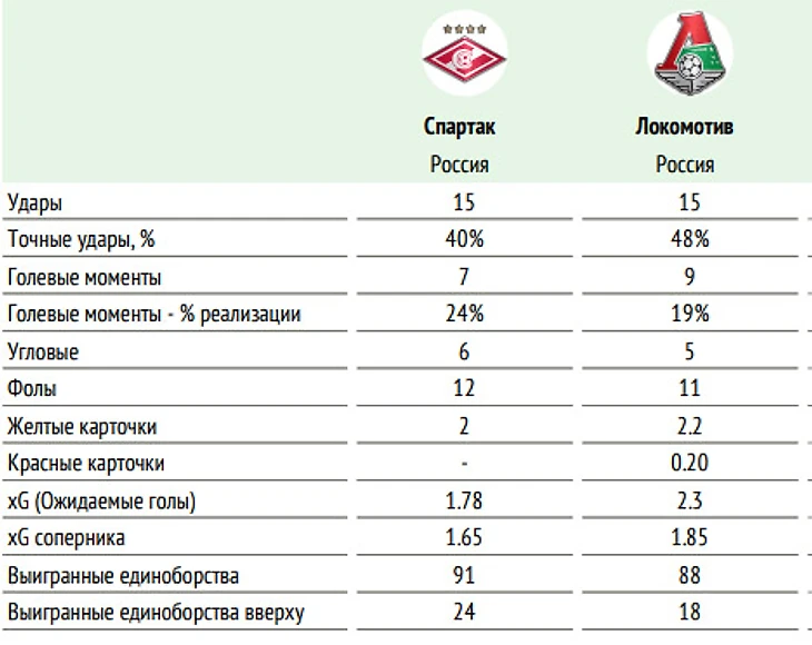 ⚖ Баланс матчей «Спартака» и «Локомотива» в чемпионатах России: суммарный: +26=16-20, мячи 93:68. на поле «Спартака»: +16=5-10, мячи 55:39 последние пять матчей «Спартака» и «Локомотива» на поле «Спартака» – 3:4, 2:1, 1:1, 2:1, 1:1.
