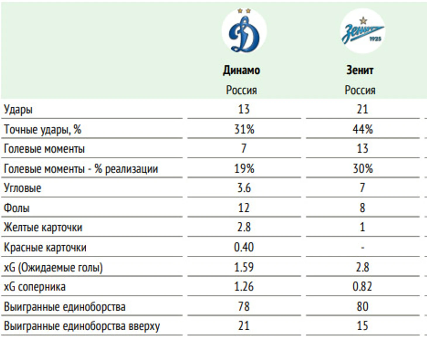 ⚖ Баланс матчей «Динамо» и «Зенита» в чемпионатах России: суммарный: +11=15-26, мячи 48:74 на поле «Динамо»: +8=7-11, мячи 29:33 последние пять матчей «Динамо» и «Зенита» на поле «Динамо» – 0:0, 1:0, 0:2, 1:0, 1:1.