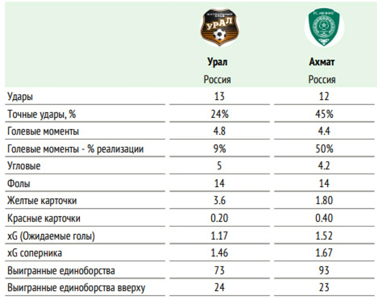 ⚖ Баланс матчей «Урала» и «Ахмата» в чемпионатах России: суммарный: +5=8-5, мячи 22:23 на поле «Урала»: +4=3-2, мячи 14:11 последние пять матчей «Урала» и «Ахмата» на поле «Урала» – 2:0, 2:1, 3:0, 1:1, 0:0.
