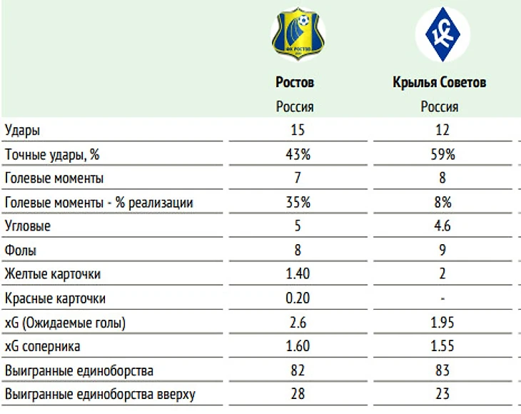 ⚖ Баланс матчей «Ростова» и «Крыльев Советов» в чемпионатах России: суммарный: +20=15-17, мячи 65:59 на поле «Ростова»: +12=8-6, мячи 34:26 последние пять матчей «Ростова» и «Крыльев Советов» на поле «Ростова» – 1:1, 2:1, 0:1, 1:0, 1:0.