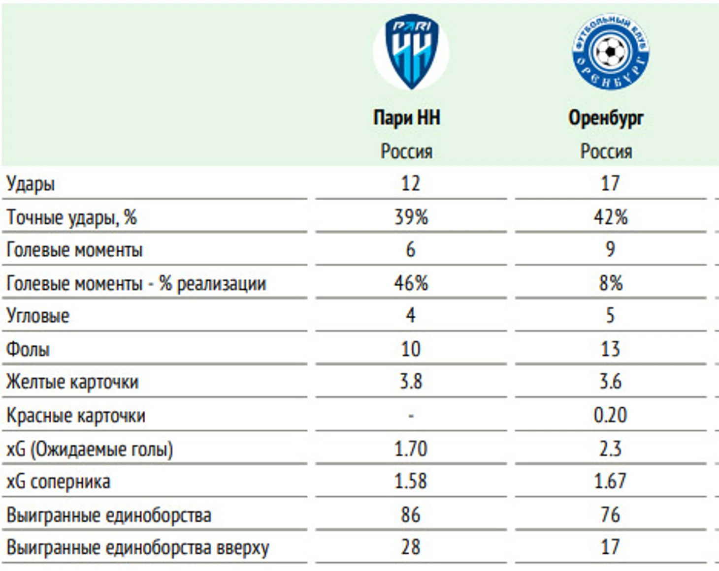 ⚖ Баланс матчей «Пари НН» и «Оренбурга» в чемпионатах России: суммарный: +0=1-3, мячи 1:6 на поле «Пари НН»: +0=1-1, мячи 0:1 последние два матча «Пари НН» и «Оренбурга» на поле «Пари НН» – 0:1, 0:0.