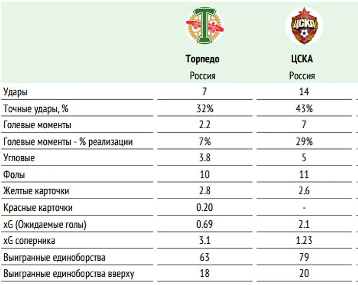 📖 Факты: ◉ У «Торпедо» серия из шести поражений. ◉ «Торпедо», как и «Урал», забило меньше всех мячей в этом чемпионате – всего четыре в девяти турах. При этом два мяча из четырёх провели в свои ворота соперники автозаводцев, а еще один они забили с пенальти. ◉ «Торпедо» не может уберечь свои ворота от пропуска мячей в играх с ЦСКА на протяжении 13 последних матчей РПЛ – с апреля 2001 года. Причём в 12 из них оно пропускало по два и более гола. ◉ В десяти последних матчах РПЛ у ЦСКА лишь одно поражение. ◉ С другой стороны, ЦСКА в последних восьми гостевых матчах одержал лишь одну победу. ◉ 100-й матч в РПЛ может сыграть полузащитник ЦСКА Константин Кучаев. 90 из них он провёл за армейцев и девять – за казанский «Рубин». ◉ 3417 дней матчи чемпионата России не игрались на стадионе «Лужники». В последний раз главная футбольная арена страны была задействована для РПЛ 10 мая 2013 года, когда «Спартак» на ней принимал «Крылья Советов». Та встреча завершилась вничью 1:1. ЦСКА не выступал в «Лужниках» в РПЛ с апреля 2013 года (ничья со «Спартаком» – 2:2), «Торпедо» – с ноября 2006-го (ничья с «Шинником» – 1:1).