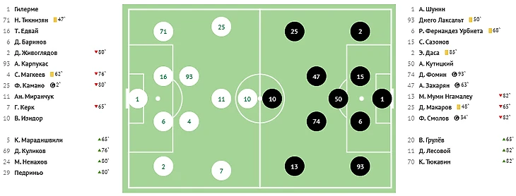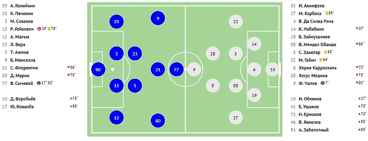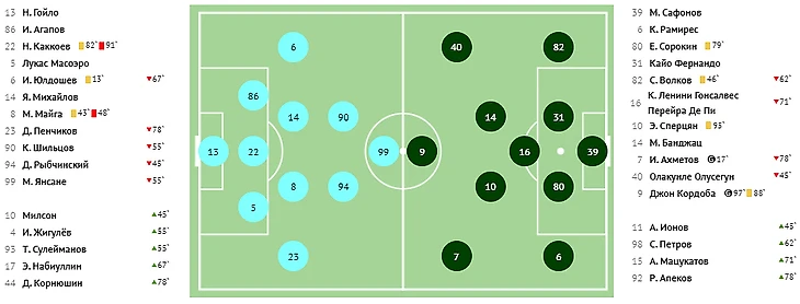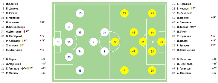 На 46-й минуте Кожемякин и Турищев заменили по позиции Смольникова и Лебеденко. Эркинов заменил Енина и стал играть левыйм инсайдом вместо Чурича, а Чурич стал играть в опорной зоне в паре с Савичем. На 68-й минуте Каймаков заменил по позиции Чурича. На 81-й минуте Лаптев, заменивший Самсонова, стал играть выдвинутого нападающего, Эркинов и Турищев исполняли роли инсайдов, Караев опустил в опорную зону к Савичу, а Каймаков стал играть левого латераля, где действовал Самсонов.
