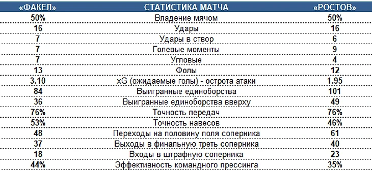 Счёт матча в соответствии с xG (ожидаемыми голами) – 3:1 в пользу «Факела». Лучший игрок матча по версии эксперта канала Матч-Премьер – Сергей Песьяков. Лучшие игроки матча по версии InStat Index – Сергей Песьяков (263), Николай Комличенко (252), Даниил Уткин (249).